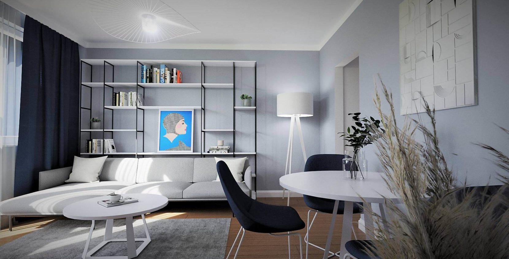 Bazą wnętrza jest neutralna szarość , biel którą dla przełamania zestawiliśmy z drewnem dębu w odcieniu jasnego kakao tworzy harmonijną całość. Elegancki i ponadczasowy granat zastosowaliśmy w dodatkach. Zabudowa RTV na całą ścianę pełni jednocześnie funkcję przechowywania.